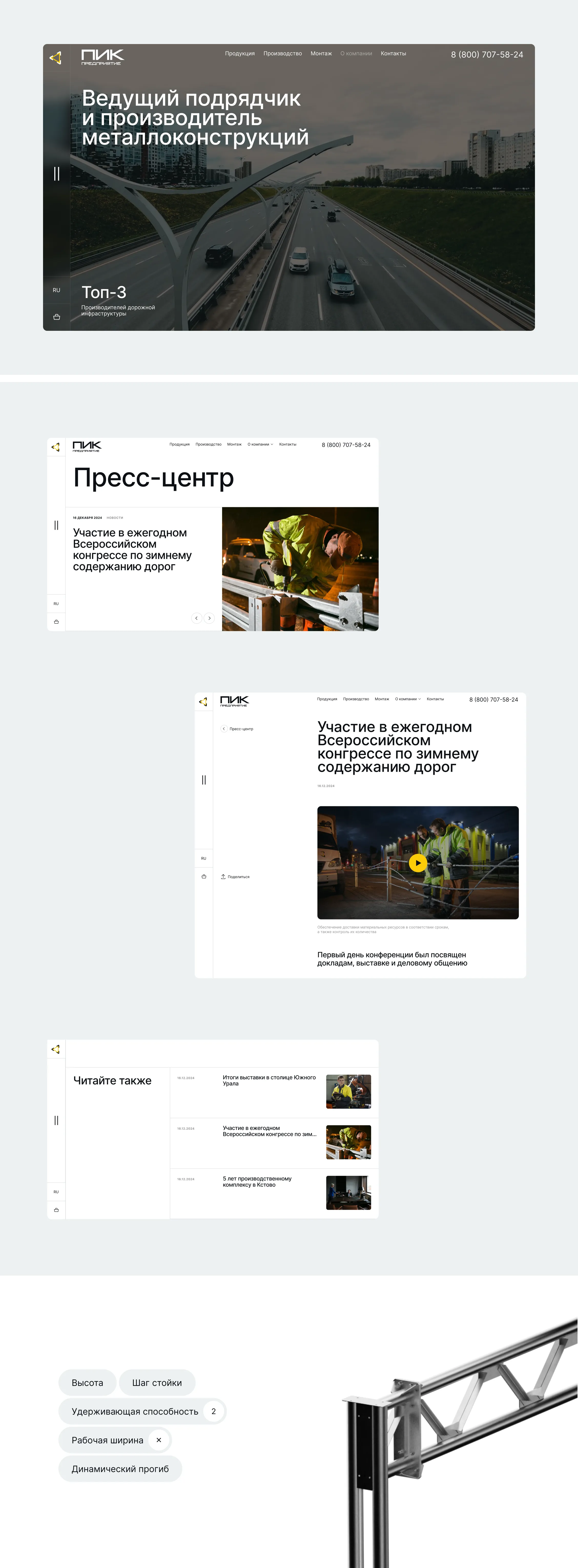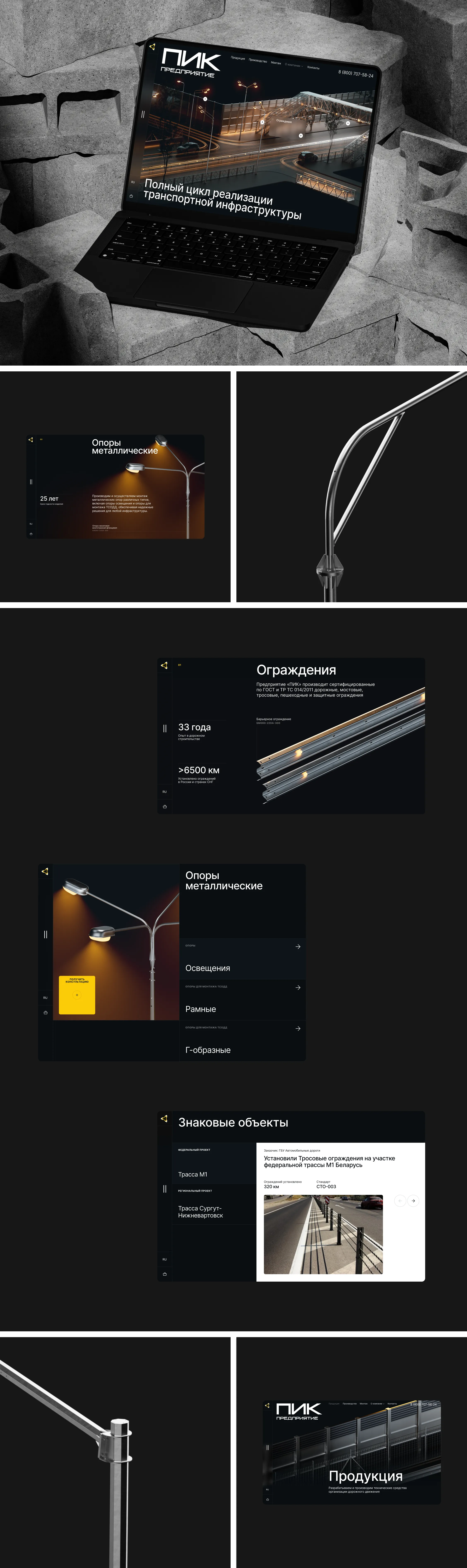 Нам было ясно, что косметическими правками здесь не обойтись, и проект требует пересборки всей визуальной коммуникации. Мы рассматривали сайт как бизнес-систему и начали с поиска метафоры, напрямую связанной с деятельностью клиента и понятной на уровне ощущений. Такой метафорой стала дорога, поскольку Предприятие ПИК обеспечивает движение и связи между объектами, и именно эту логику мы перенесли в цифровую среду, задав ритм, направление и сценарий взаимодействия с сайтом.