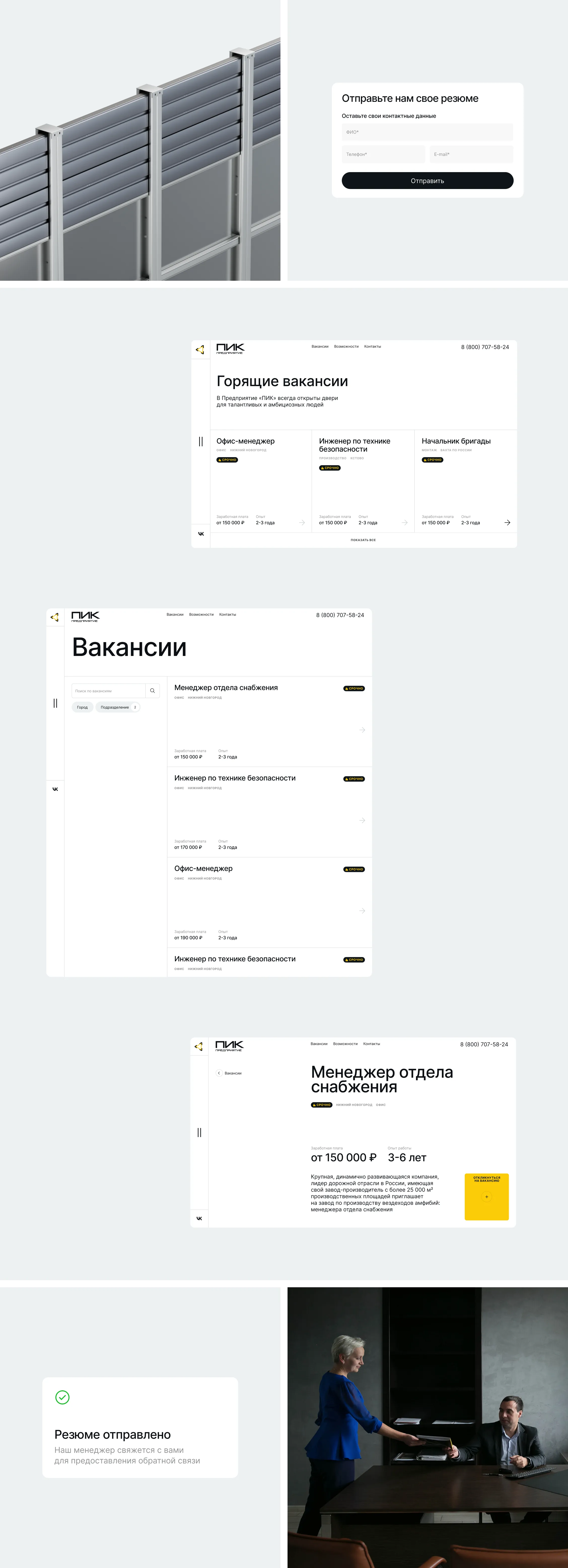 Для Предприятия ПИК отдел кадров — полноценная часть бизнеса, поэтому модуль отдела кадров мы делали как отдельный инструмент внутри общей системы. Он стал точкой входа для специалистов и упростил процесс отклика на вакансию. Это позволяет Предприятию ПИК эффективно конкурировать за инженерные кадры.